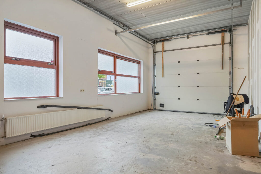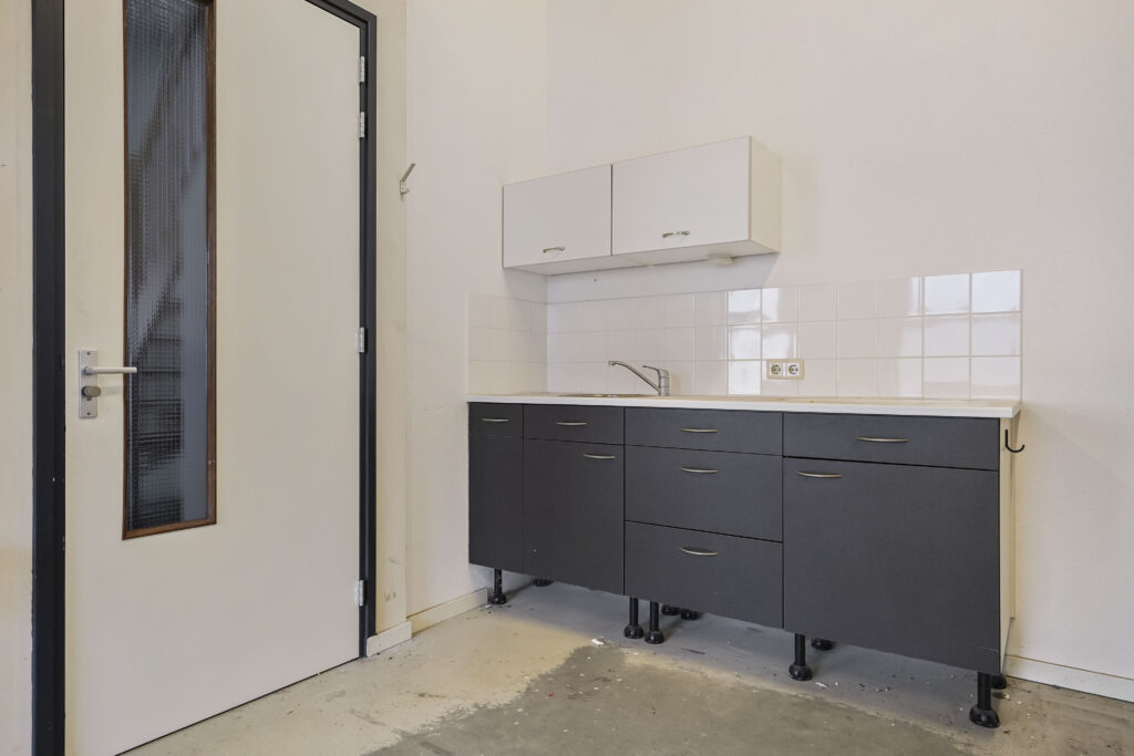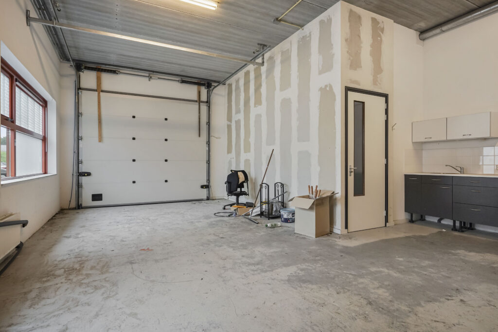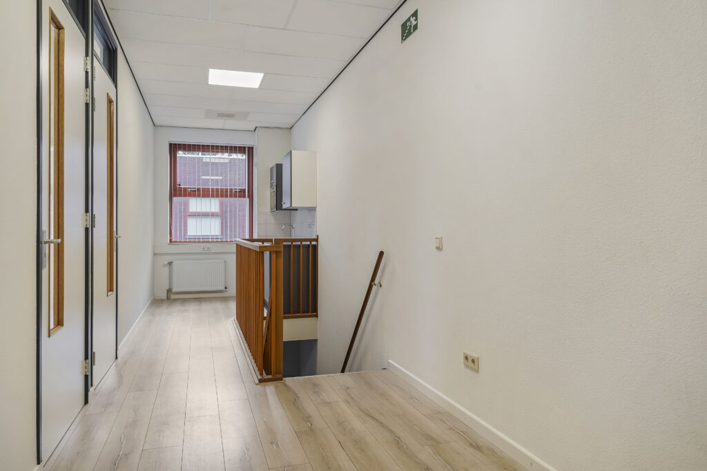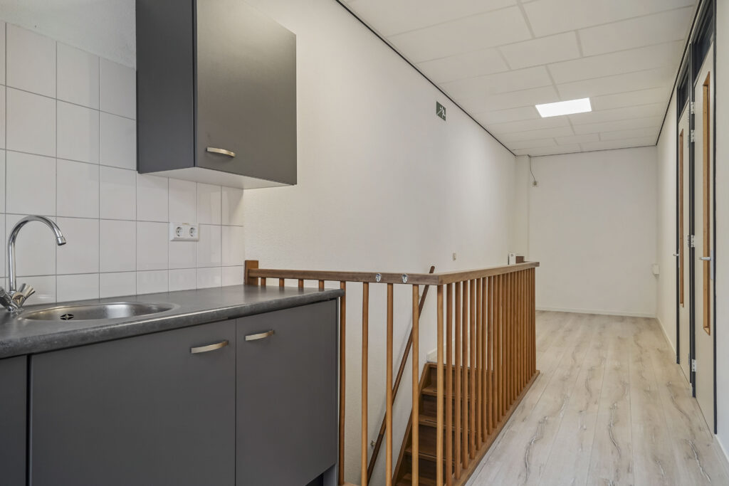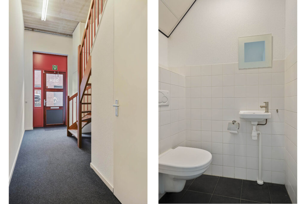 Via de entree komt u via de trap op de verdieping. Hier treft u 2 kantoorkamers en een nette pantry op de gang. Vanuit de entree komt u tevens in de bedrijfsruimte, waar ook een pantry is geplaatst en de overheaddeur zich bevindt. De toiletruimte bevindt zich ook op deze begane grond.