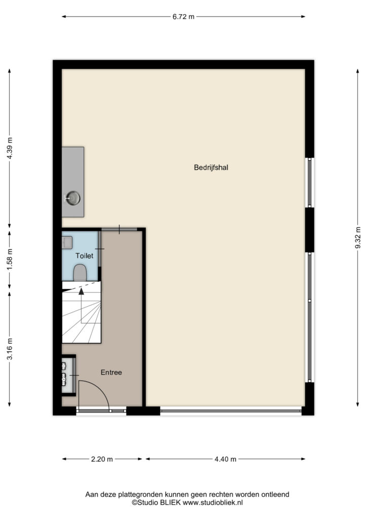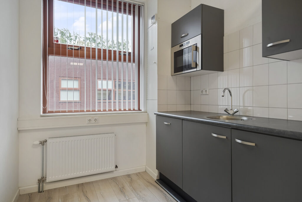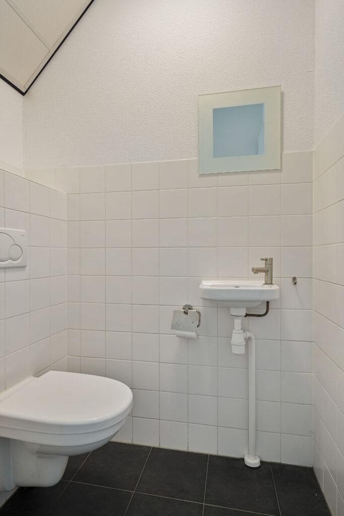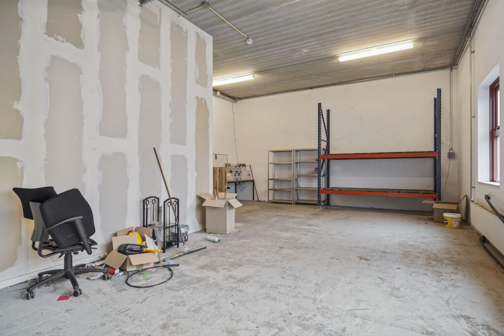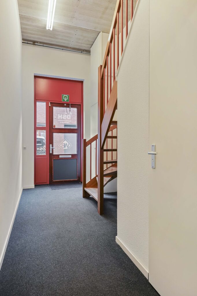 Via de entree komt u via de trap op de verdieping. Hier treft u 2 kantoorkamers en een nette pantry op de gang. Vanuit de entree komt u tevens in de bedrijfsruimte, waar ook een pantry is geplaatst en de overheaddeur zich bevindt. De toiletruimte bevindt zich ook op deze begane grond.